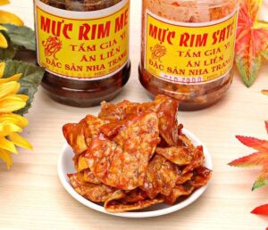 Mực rim me là món đặc sản vừa có thể mua về làm quà, vừa thưởng thức luôn được trên bàn ăn tụ tập. Mực Nha Trang tươi rói được phơi khô rồi cán mỏng, Đây là một món ăn dân dã và có sức gây nghiện đáng kể