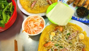 Bánh xèo là một món ăn dân dã của miền Nam nhưng đối với thành phố biển, bánh xèo là một tron những món ăn ngon ở Nha Trang được kết hợp với mực, rán giòn lên cùng giá đỗ, trứng cút,… ăn kèm cùng rau sống chấm nước mắm.