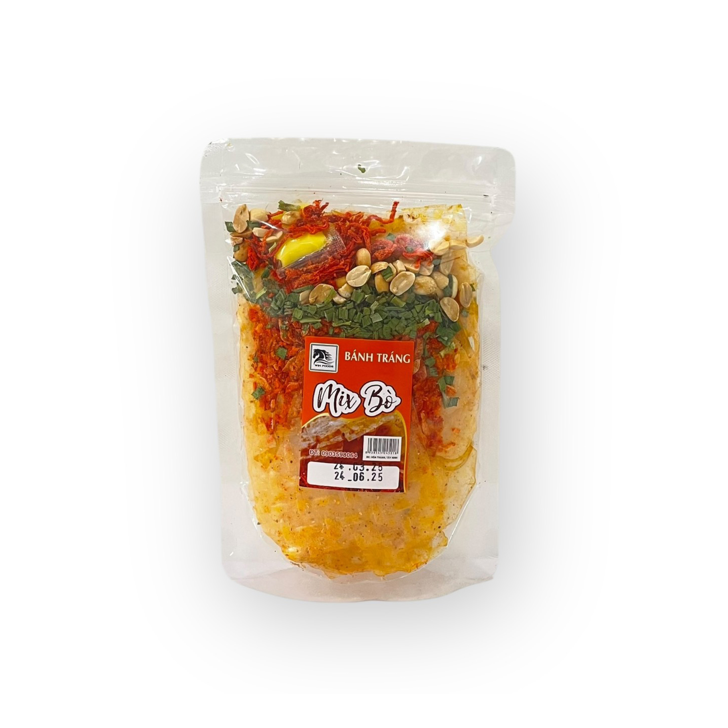Bánh tráng mix bò là sự kết hợp hài hòa giữa bánh tráng mỏng dai truyền thống. Được cắt sợi thủ công, với bò (hay còn gọi là ruốc bò) sấy khô, thơm lừng, mặn mà. Điểm nhấn của món ăn chính là lớp sốt trộn đậm đà. Được chế biến từ tỏi phi, hành khô, sa tế, mắm me, muối tôm Tây Ninh. Và một chút ớt cay nhẹ. Tất cả hòa quyện lại tạo nên một món ăn vừa giòn dai, vừa cay nồng, lại thoang thoảng vị ngọt thanh và béo nhẹ.