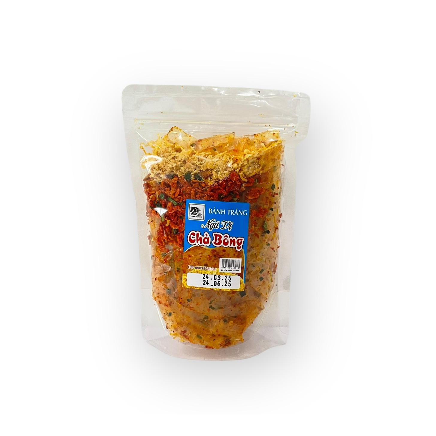 Bánh tráng ngũ vị chà bông được làm từ bánh tráng dẻo truyền thống. Kết hợp cùng 5 loại gia vị hấp dẫn gồm: tỏi phi vàng giòn, hành phi thơm lừng. Sate cay nhẹ, nước sốt me chua ngọt, và lớp chà bông đậm đà phủ bên trên. Mỗi lớp gia vị đều được chế biến thủ công. Đảm bảo vệ sinh và giữ trọn hương vị đặc trưng.