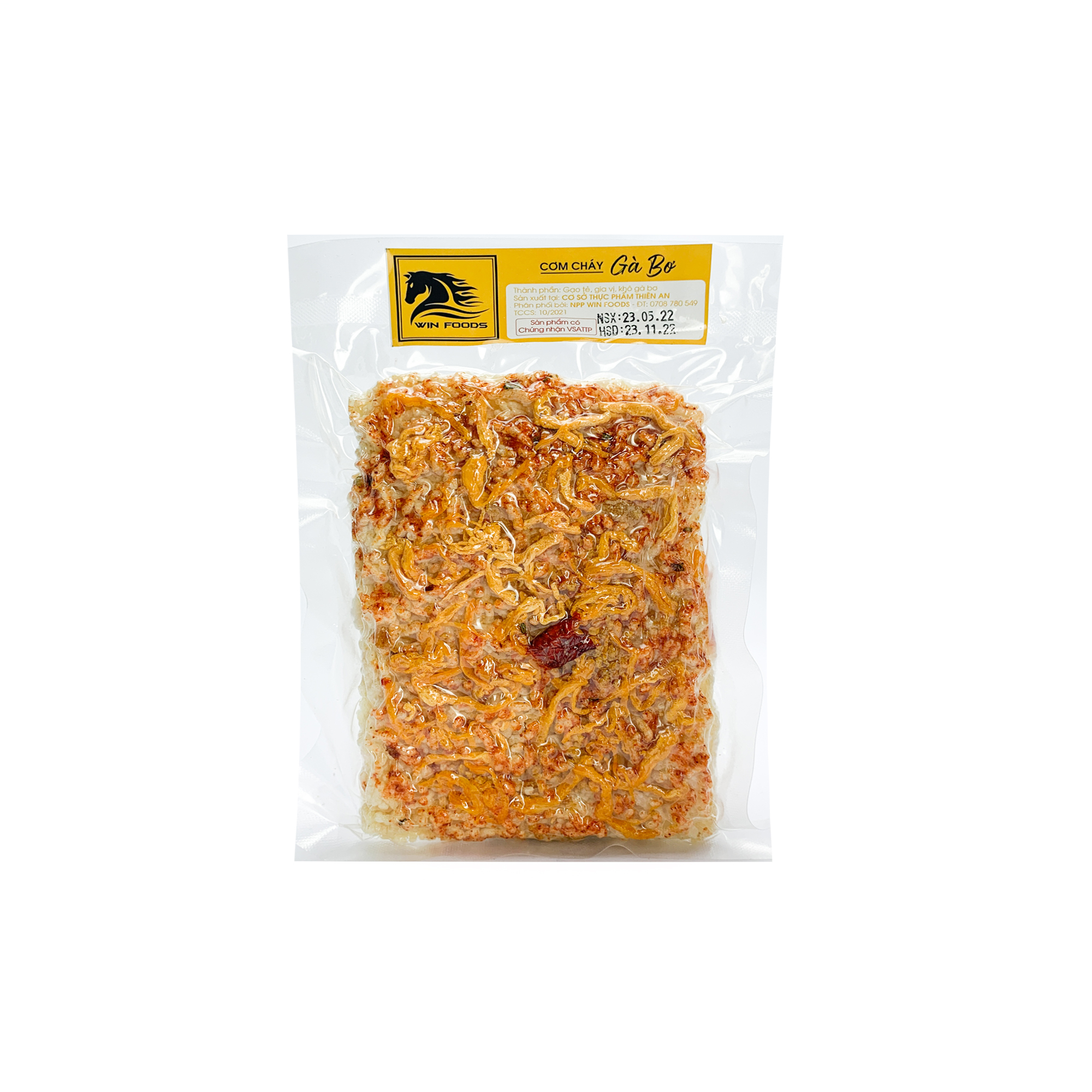 Cơm cháy gà bơ là sự kết hợp tinh tế giữa phần cơm cháy giòn tan. Lớp sốt gà xé đậm đà và hương thơm béo ngậy của bơ tỏi phi. Mỗi miếng cơm cháy được chế biến từ loại gạo dẻo thơm, chiên vàng đều để tạo độ giòn rụm. Không quá cứng, không ngấy dầu.