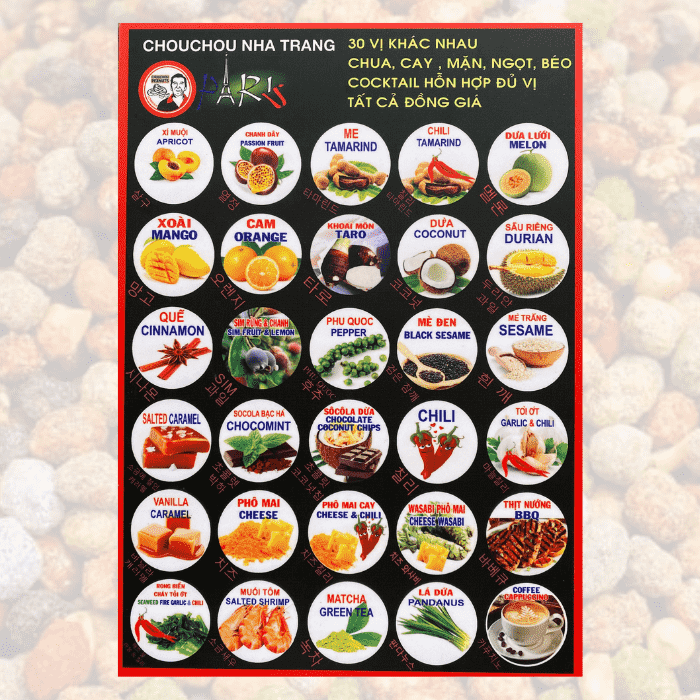 Sự kết hợp những hương vị đặc sản Nha Trang như Xoài Cam Ranh, Sầu riêng Khánh Sơn,….. đã làm nên các sản phẩm Chou Chou nhiều màu sắc như vị sầu riêng nức mũi, vị chanh dây dịu mát cho tới vị dừa thơm ngon, hay là cái vị Capuchino sang chảnh cho đến cái vị ớt cay rớt nước miếng,… Mà cái vị nào cũng ngon, cũng thơm, và đầy mời gọi.