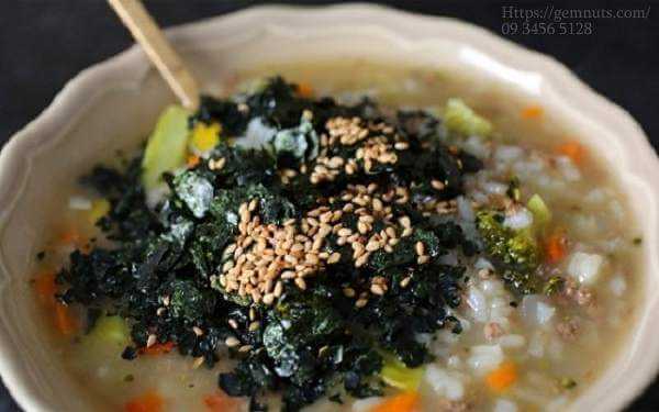 - Bước 3: Múc cháo ra bát, cho hạt mè trắng và rong biển vô rồi thưởng thức